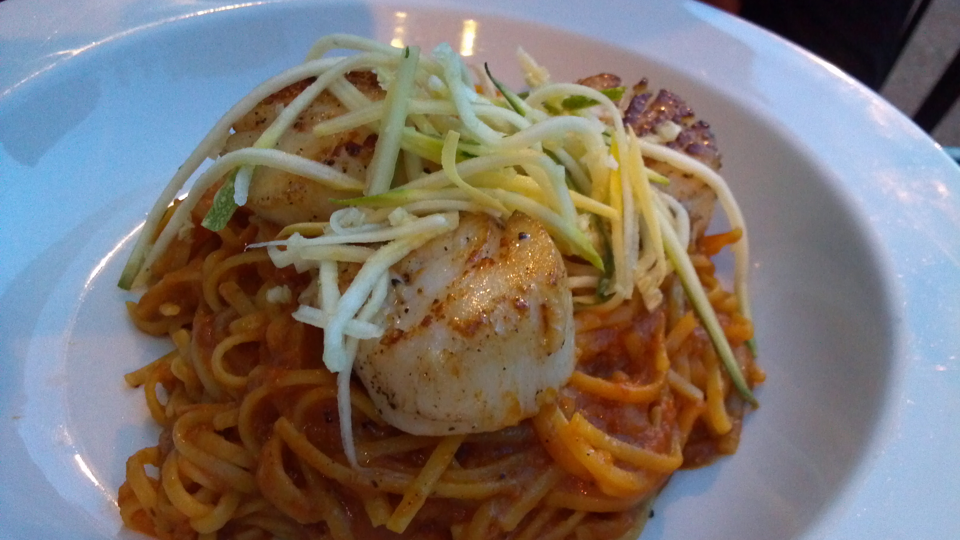 We weren’t super hungry so we skipped an appetizer and went straight to entrees. Jill ordered the seared Sea scallops served over quinoa linguine with a unique roasted tomato and sweet carrot sauce. The dish was savory yet slightly sweet. The scallops came perfectly seared and were plump and absolutely fresh. The sauce, though, was what set the dish apart. It was truely unlike any other preparation of scallops either of us have seen. The sauce was delicious. I would never have imagined something that rustic and harvest oriented would work over scallops.