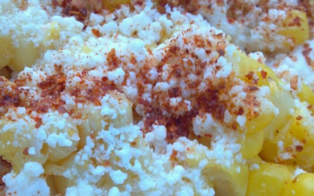 The vender cuts the kernels off the corn by hand each time, mixes it with butter, Parmesan cheese, paprika, lime, chile and salt.