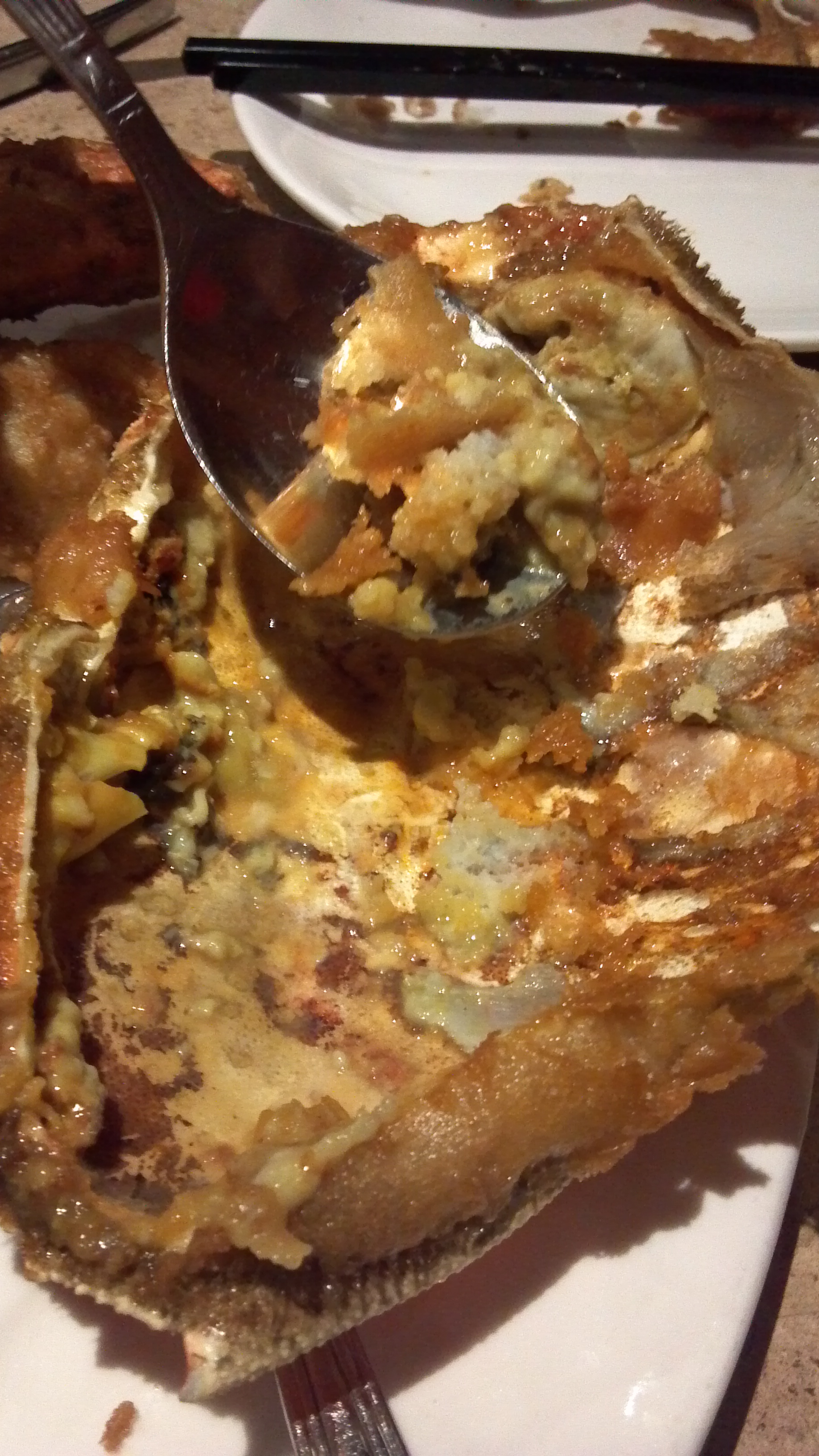 Okay, alright already… friggin’ the top shell!! So…the BEST MEAT of the entire crab…is in the head. You flip over the shell and before you sits the good fried nectar of the Gods. Spoon it out and you have one of the tastiest bites imaginable – not exaggerating. Creamy, meaty, tender, a little fishy, but mostly ocean fresh. So many sensations and thoughts were surging through my body. I wanted another shell! But that would mean I’d have to order another Crab. Good grief.