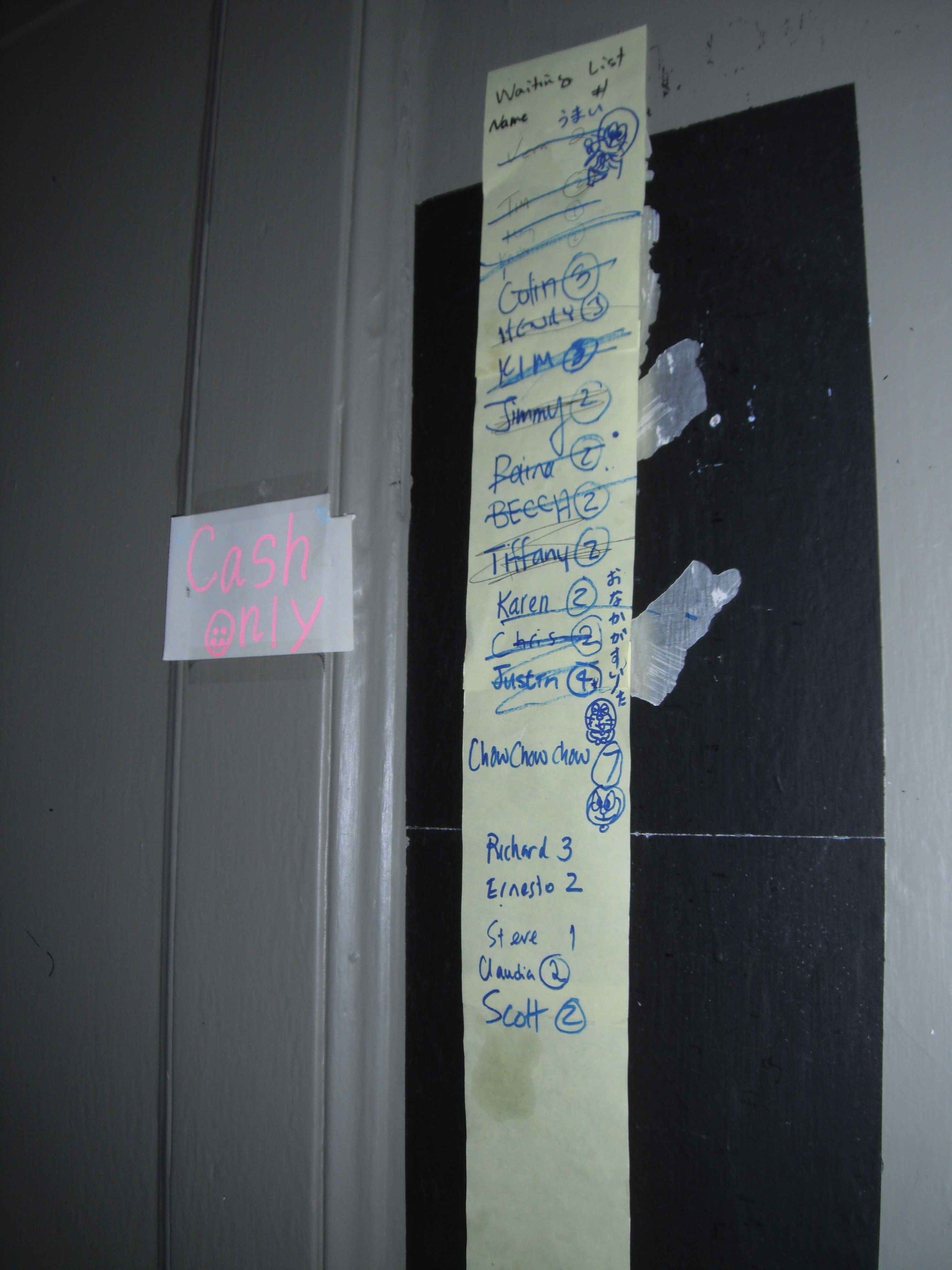 The process of obtaining a table is also unique. There’s a long sheet of paper outside with a marker and you write your name and the size of your party on the paper yourself and they come out and call ’em off one by one when there’s a table available. It’s very diplomatic. No squeezing people in, plus you can ALWAYS see where you stand in line.
