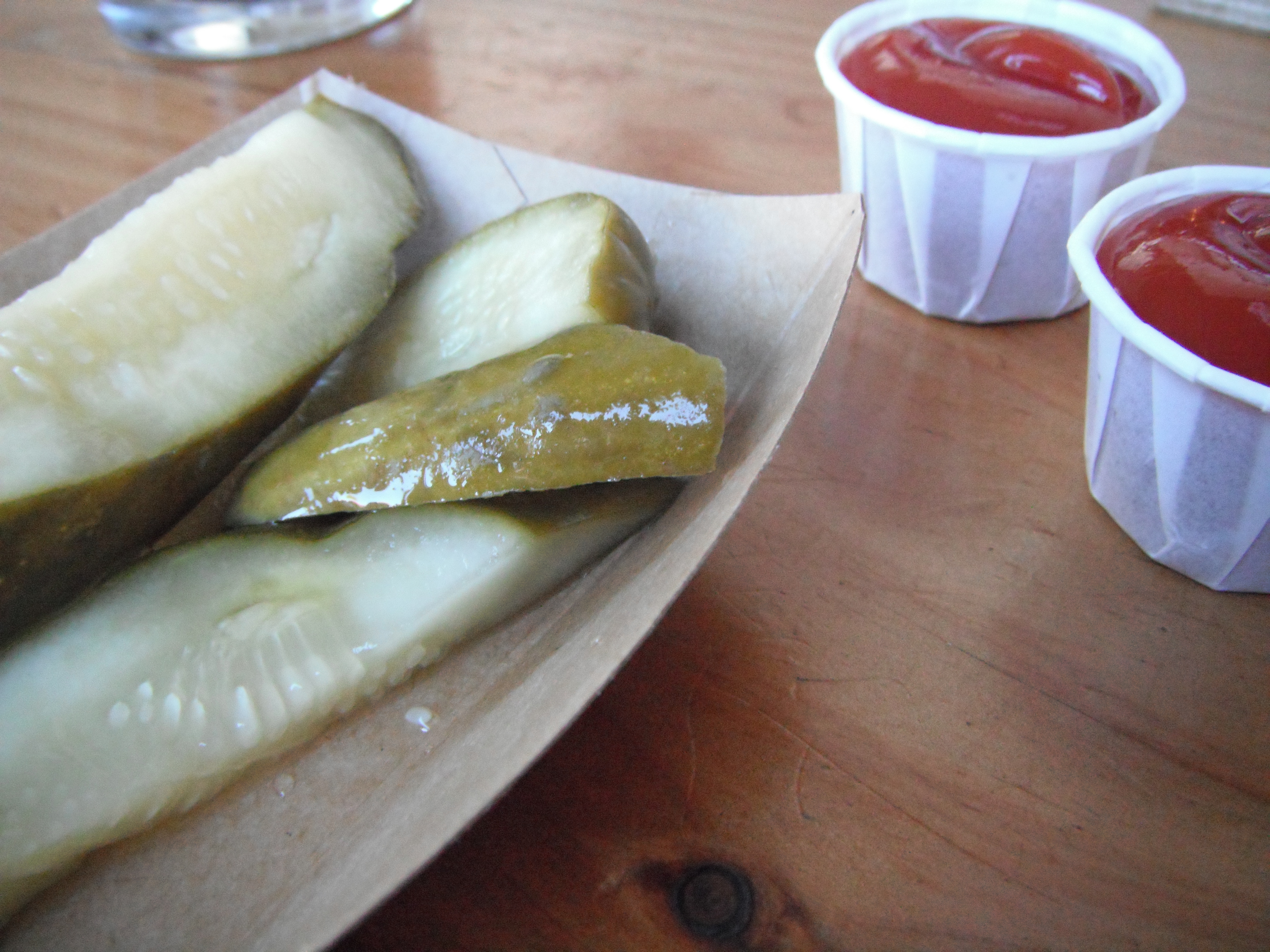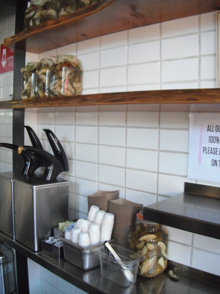 And now for something completely different. They had a little condiment station off to the side that had serve yourself pickles. They were house made and absolutely awesome to enjoy before, during and after your burger. They were cut in pieces smaller than your typical spear which actually made it seem a lot easier to eat more. Sour dill with a touch of garlic. They were great, and we didn’t feel guilty taking as many as we wanted to enjoy.
