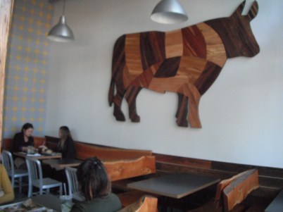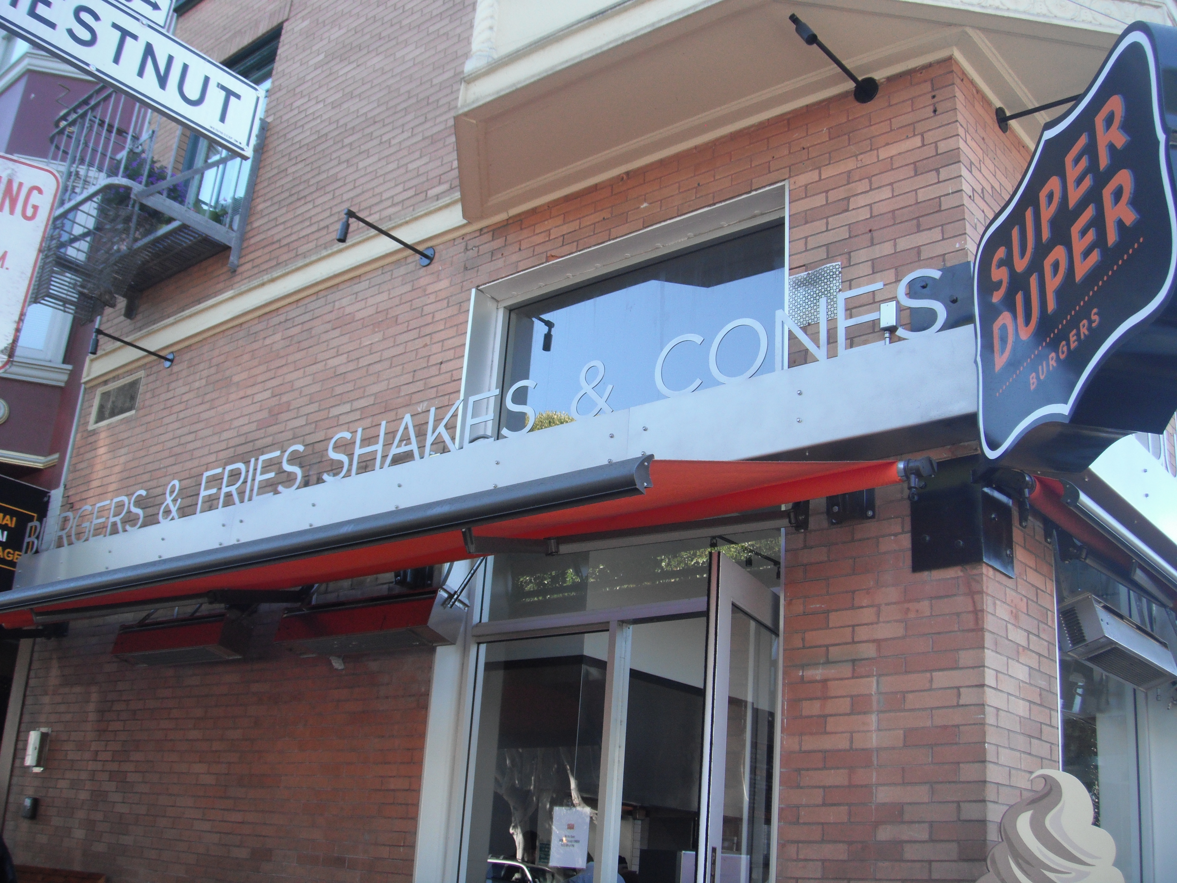 Jill and I pulled our over in a neighborhood that seemed younger, hip and had great food options for a quick lunch (or two) in San Francisco. We had also done some Yelp research and found a number of excellent spots for ground beef between bread. Perched on a corner and looking mighty sleek from the outside is Super Duper Burger (2034 Market St. San Francisco). They sport a fresh, clean and classic look with a focus on farmy stuff yet it feels modern and chic.