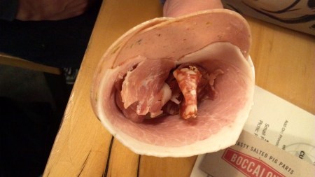 Chris Cosentino’s Boccalone was our first pit stop. Salted pig parts is their specialty in the form of sandwiches and plain ol’ sliced meat – the gluten free route. We had to try one of their specialty “meat cones” – it’s what they’re most known for.
