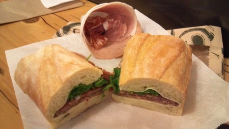 After some guidance by the gentleman taking orders, we were steered towards the Boccalone Combo sandwich with greens and an herbaceous oregano vinaigrette. Served on a nice soft Italian sub roll, the sandwich came with three different types of salami, more capocollo and the addition of the super sharp provolone is just what was needed to take the sandwich from great to excellent.
