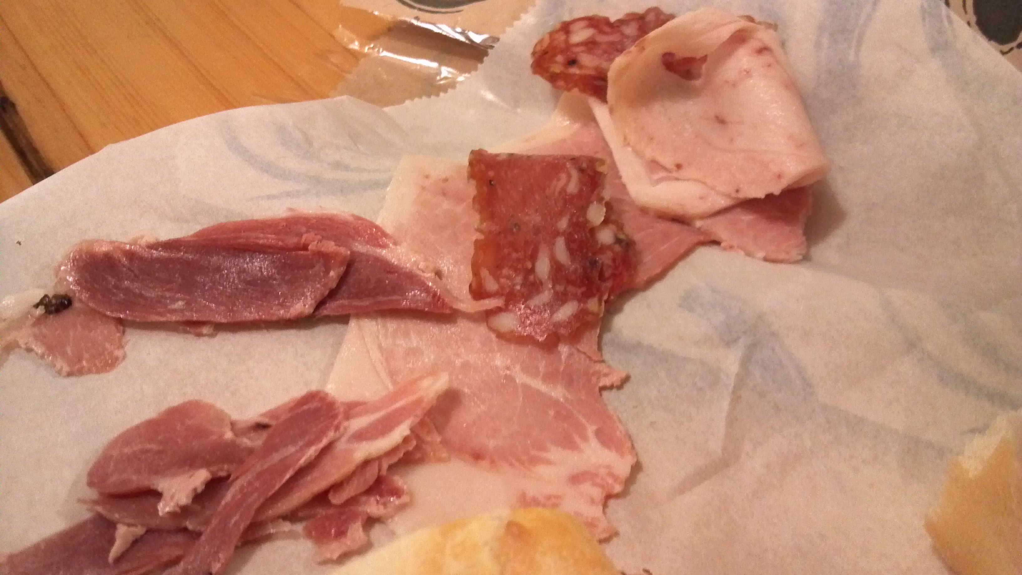 You’re presented a snow cone of pig – heavenly. Mortadella, house made salami, capocollo, and prosciutto cotto are ringed around a paper cone cup and handed to guests like a little kiddie and his ice cream cone. We disassembled the cone and went at each thinly sliced piece of meat separately.