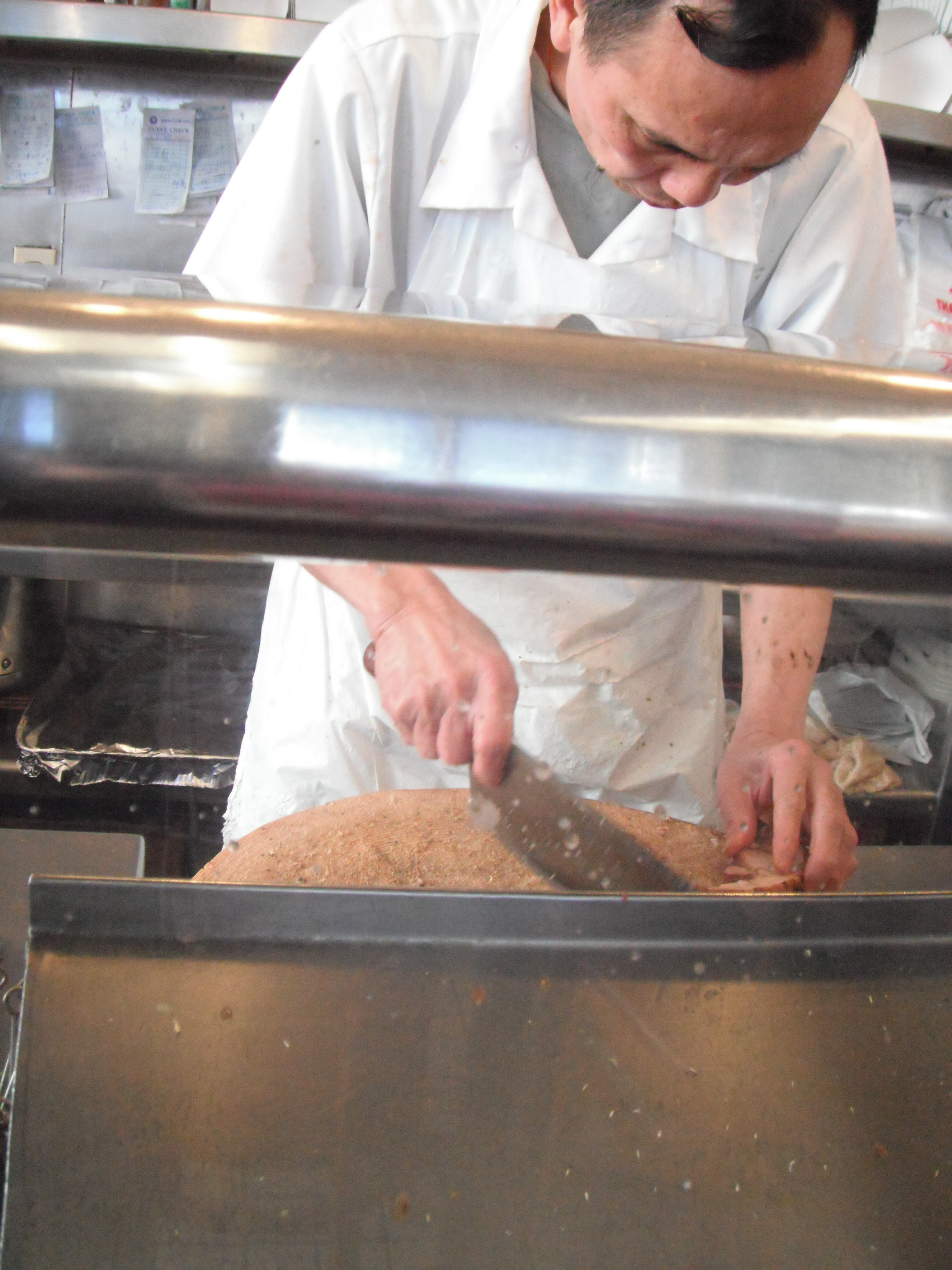Behind the counter is an ancient man quickly chopping away in a methodical manner as though he’d been doing it for decades – which I am sure is the case. Every motion is deliberate and exact dissecting each carcass the same way time and time again.