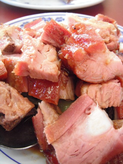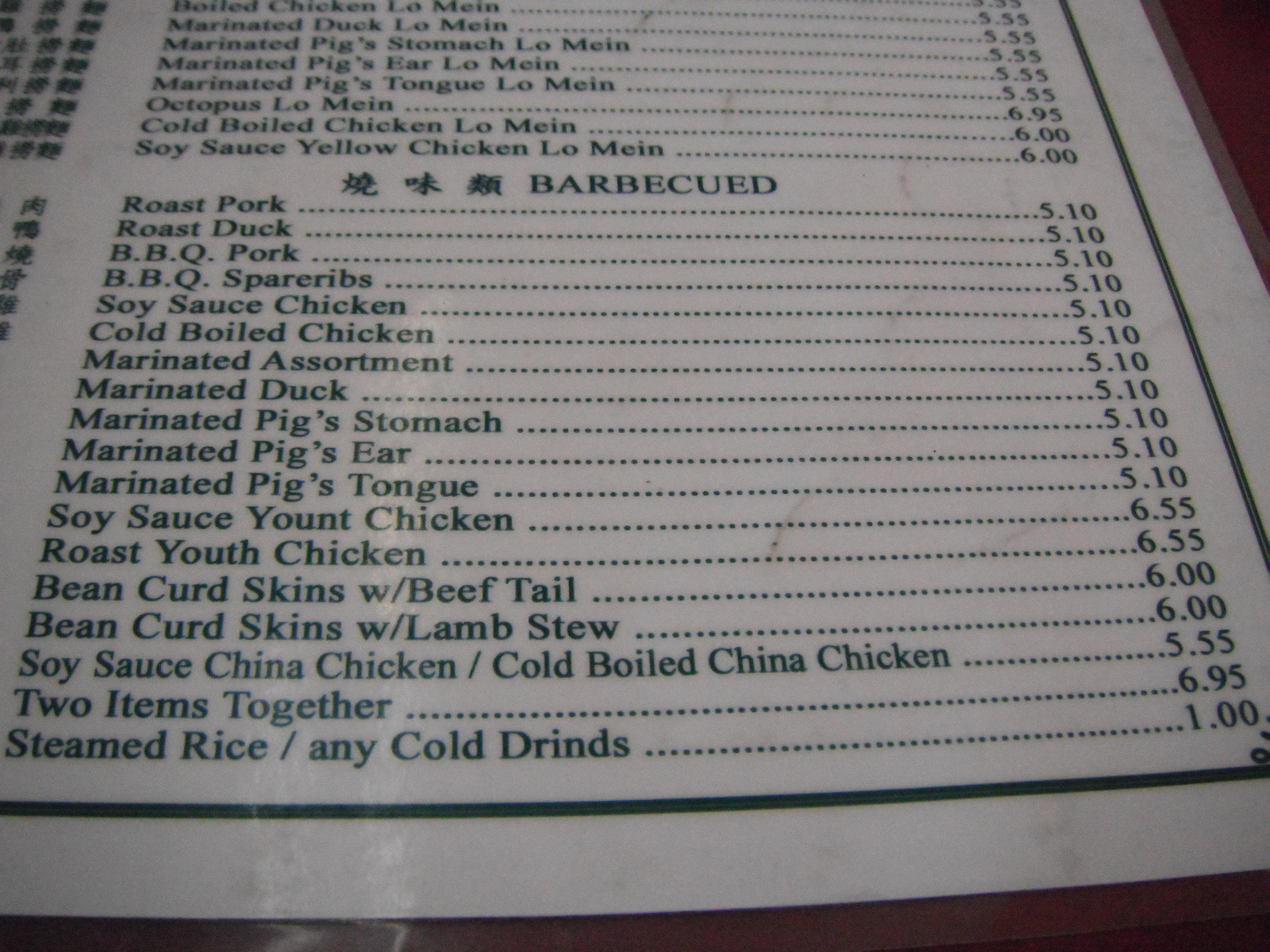 We were seated and promptly given menus that were thankfully in both English and Chinese. We made our choices based on what we saw upon entering – roast pork, roast duck, spare ribs and beef with fried noodles.