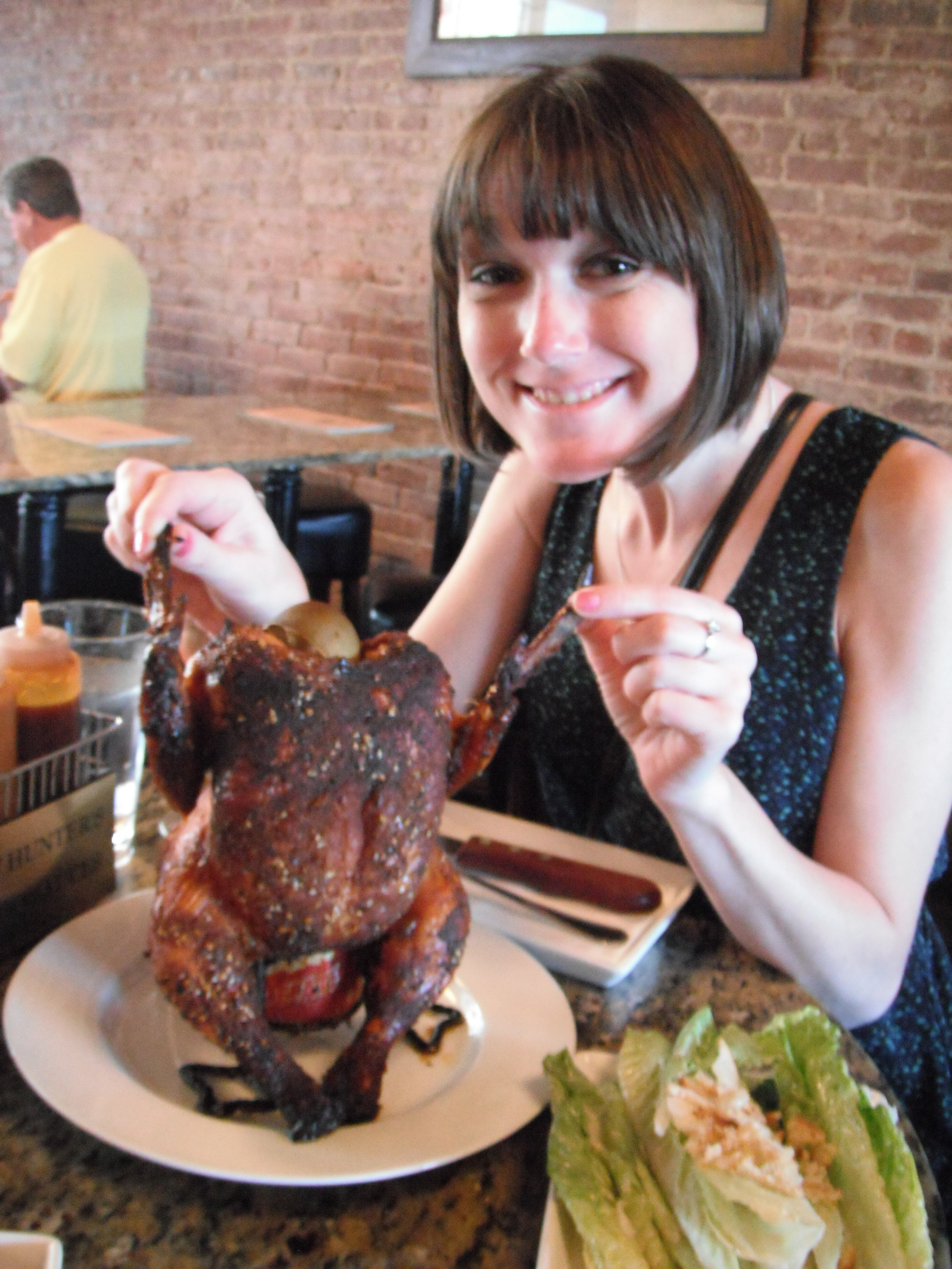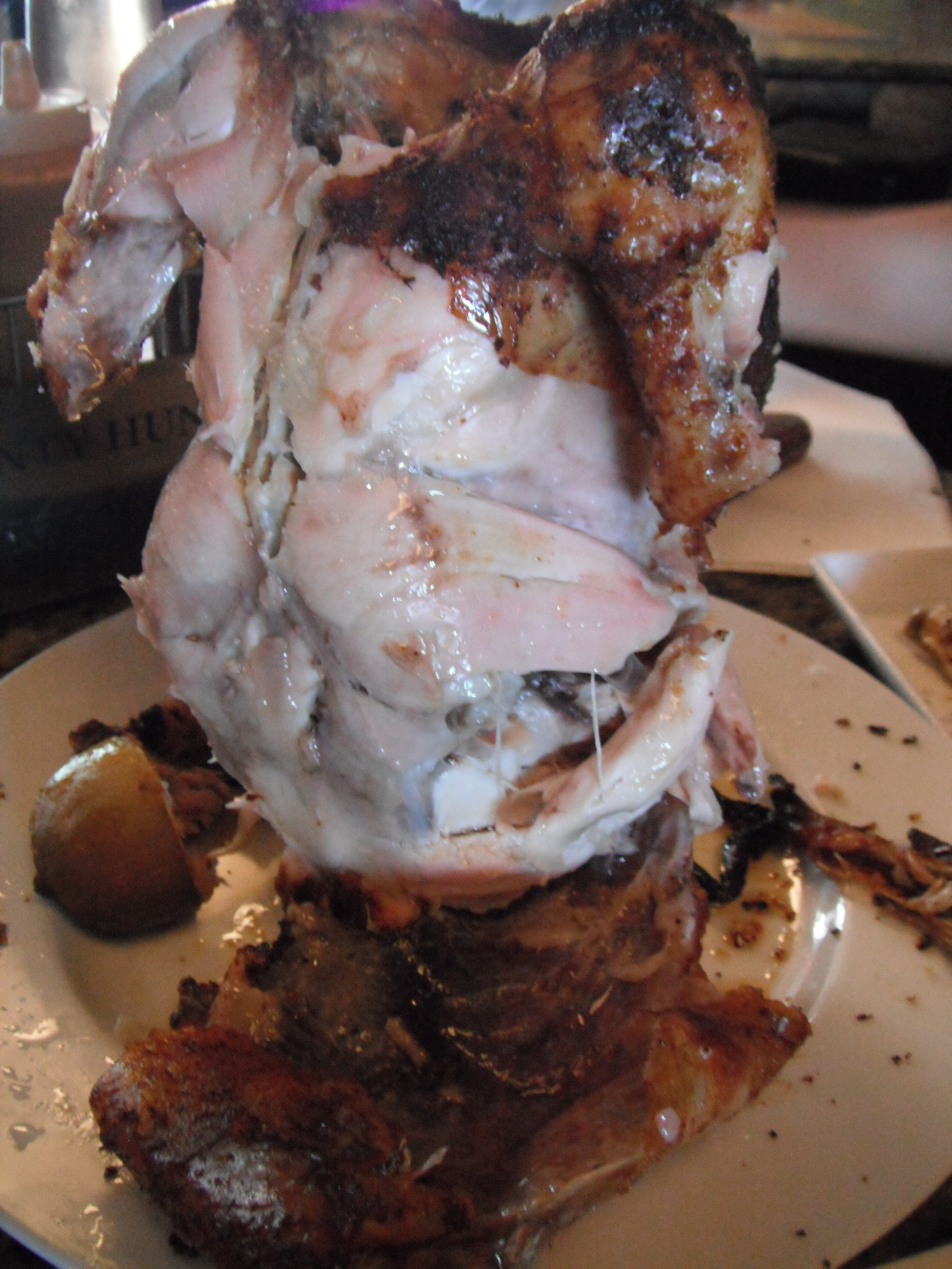 The meat had been given a nice dry rub before hitting the heat. The inside was extremely moist and flavorful. It was fun to pick apart the bird and find all the yummy nooks and crannies which were everywhere. The rub gave the skin nice spice and it was just slightly crispy.