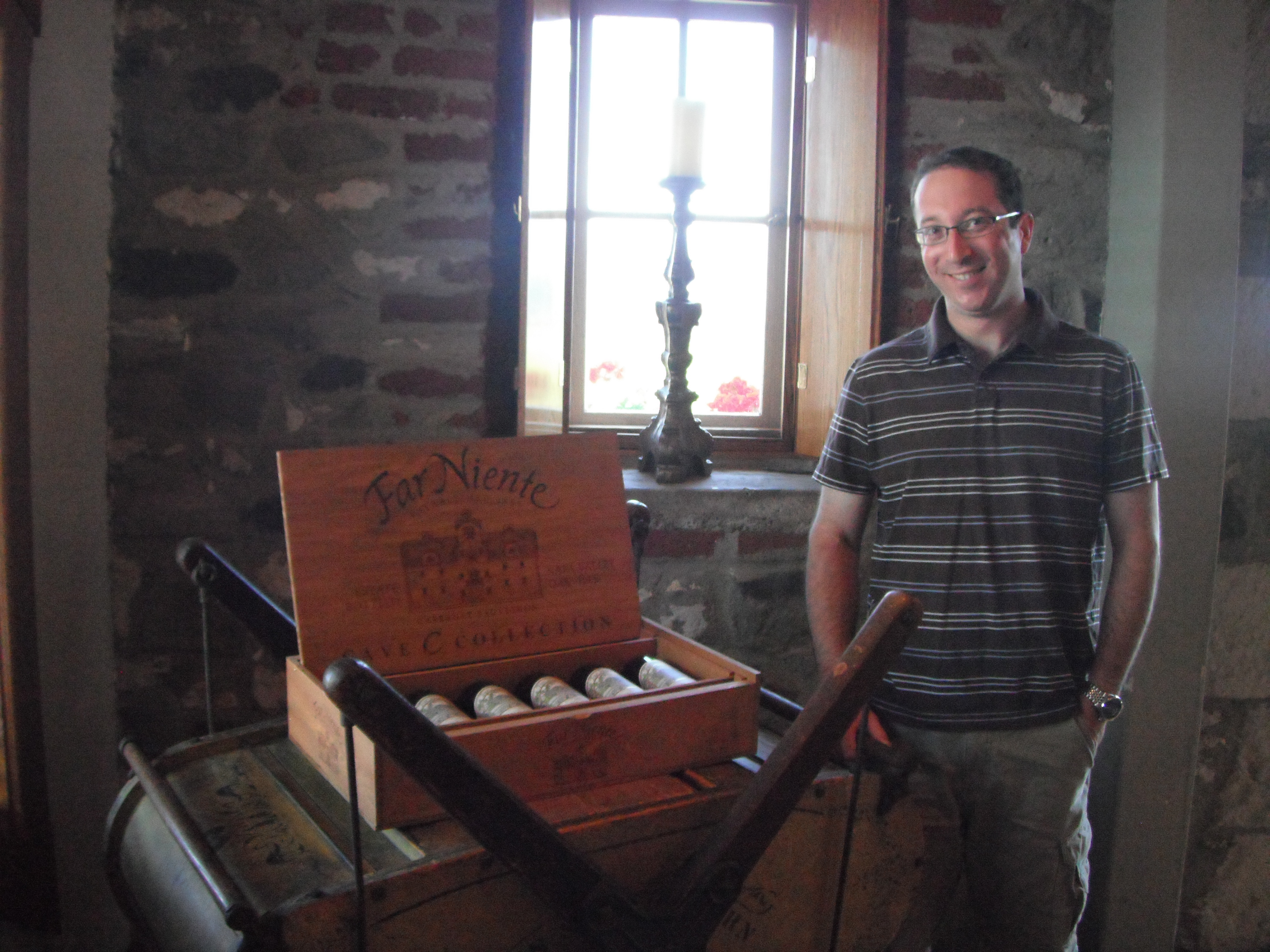 We were greeted in the main house at Far Niente by Larry Maguire, owner and President of the winery. He showed us around the property. We went through some of the vineyards. We saw the grapes coming into the winery and run through the sorting table. The place was in full swing.