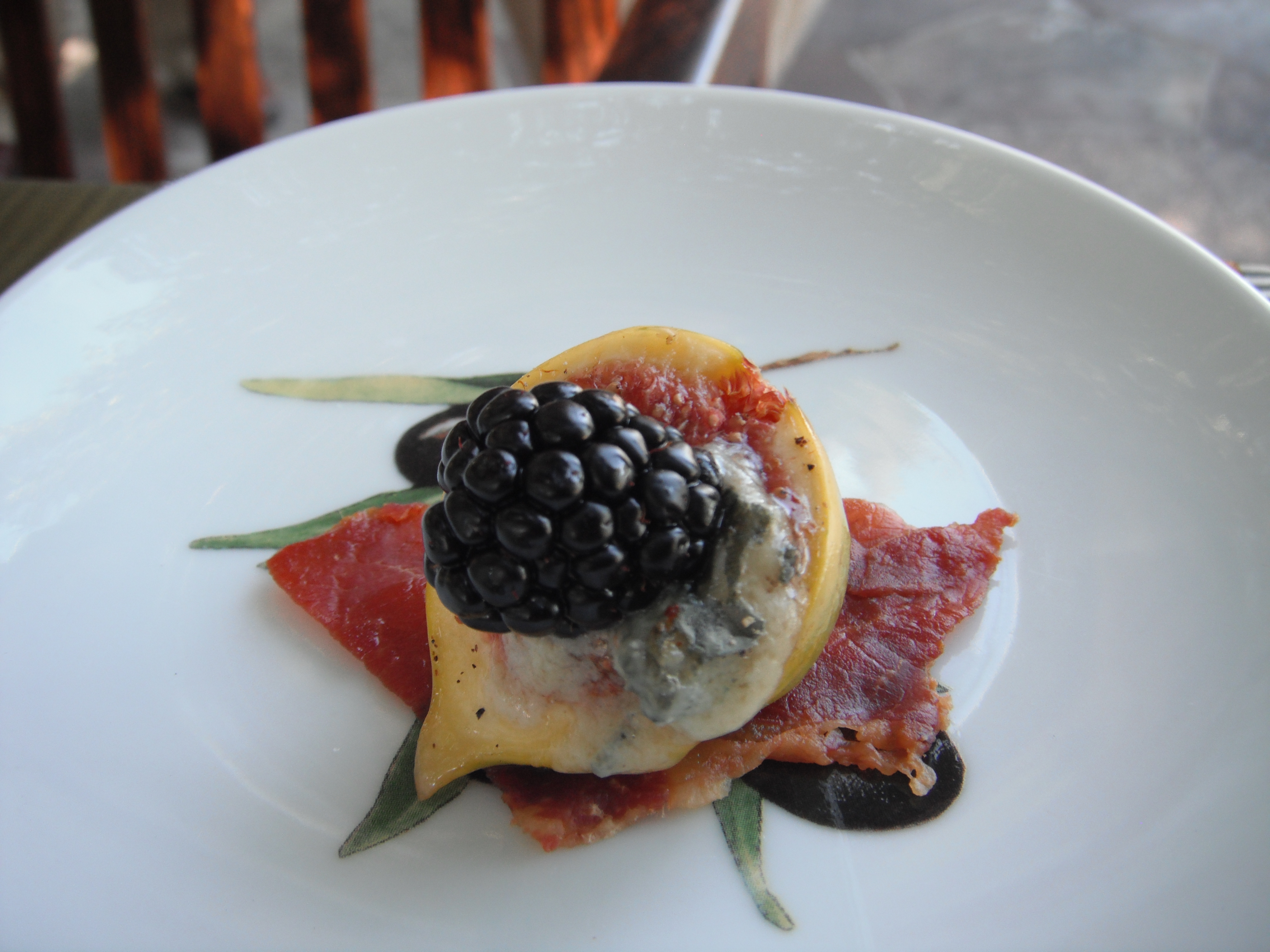 The amuse bouche was brought shortly after we were seated and Larry gave his welcoming toast to all of us, his guests. Prosciutto, a candy stripe fig, a small dollop of blue cheese and pickled blackberries. A gorgeous one bite consisting of numerous pronounced flavors. Smoky, funky, bright and acidic with the perfect crisp of the prosciutto. The course was served with Far Niente’s sweet wine – Dolce 2006. What an excellent beginning.