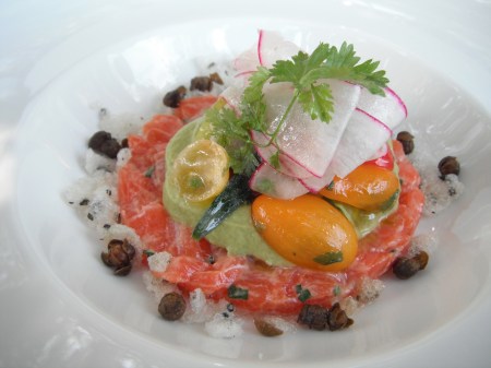 Next, one of the most gorgeous dishes I have EVER seen. King Salmon tartare, avocado mousse, crisp capers, with greens from their garden as well as marinated cherry tomatoes, radish salad and a crispy sesame crisp. There have only been two times I have not wanted to eat a dish because of its stunning beauty – here and the garden course at Alinea.