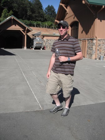 We said our goodbyes and headed over the mountain to Pride Mountain Vineyards. The property itself is located in both Napa and Sonoma counties! Really cool. In fact, there’s a line in the stonework in the driveway to their caves that marks the divide between the two counties – you can see it at my feet in the picture below.
