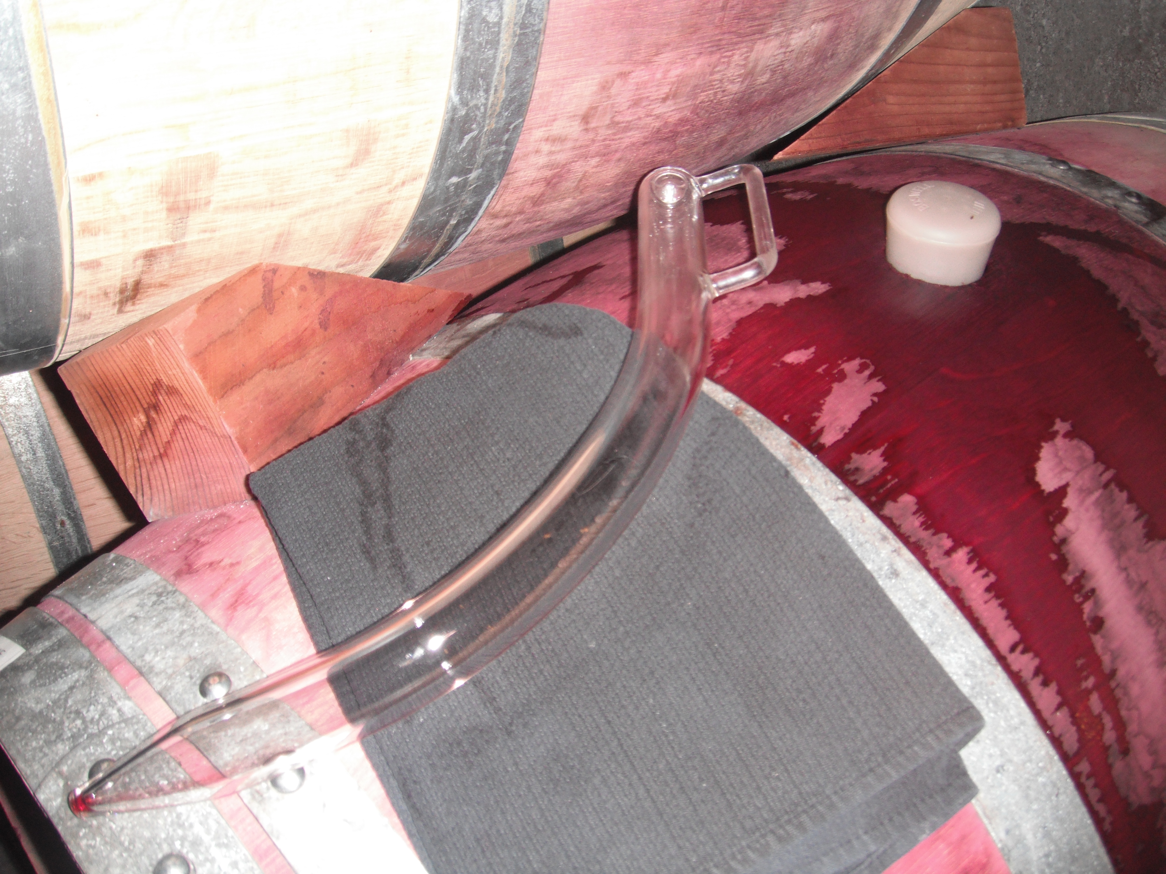 They use a special device with which the user sucks up some wine and plugs a hole in the end of the tube before it reaches his lips to hold the liquid in the vessel. When he releases his finger, wine is released. A simple but genius and pretty device. Delish.