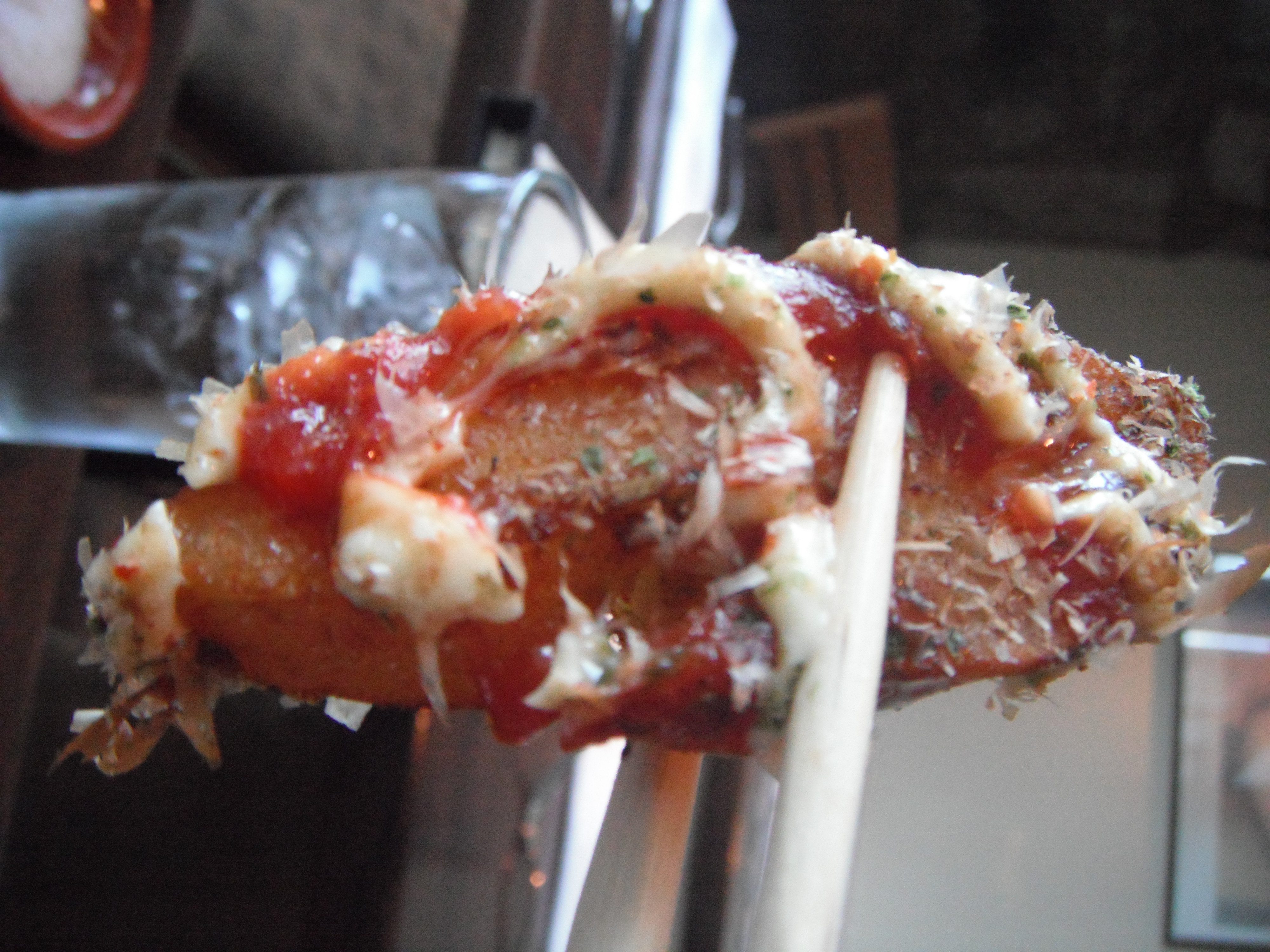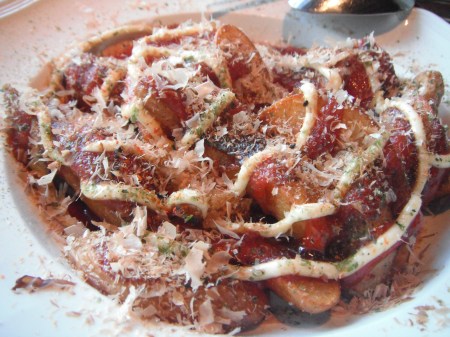 An aioli of sorts and a sweet and tangy sweet barbecue option as well. The dish was finished with bonito flakes and it was really really tasty. Unique and unlike anything I’d tasted before, the flavors were familiar but just presented in a more spuddy form.