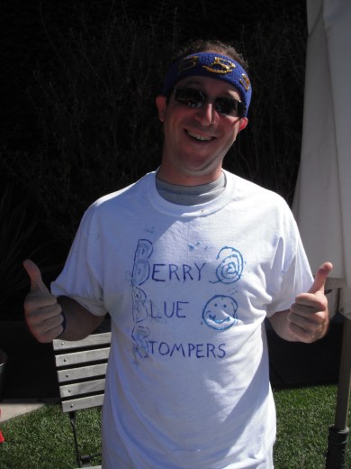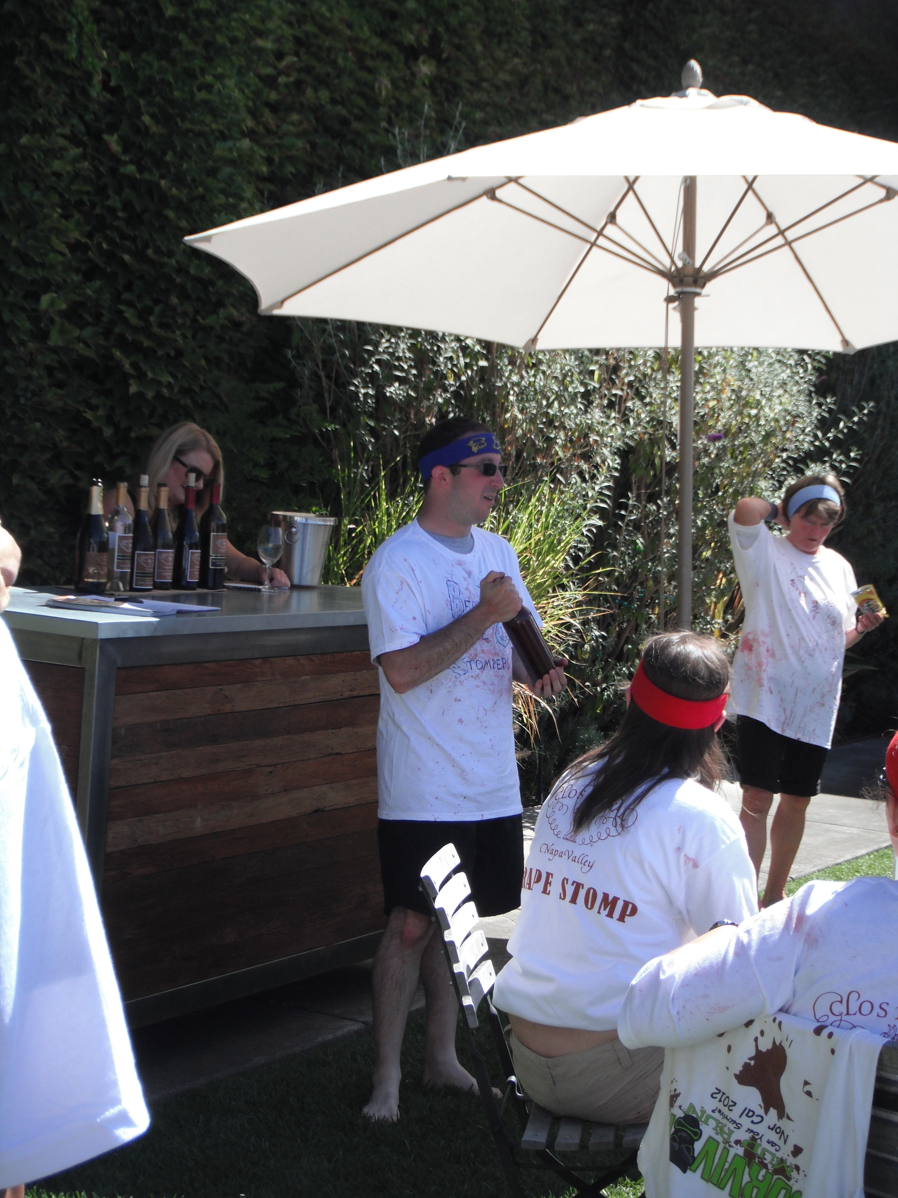 We arrived at the winery and mingled with the twenty five or so other peeps in attendance. We were greeted with a sparkling made in Australia in conjunction with Clos du Val. We were split up into teams or four and were given t-shirts, headbands and markers to decorate our “uniforms” for the stomp!