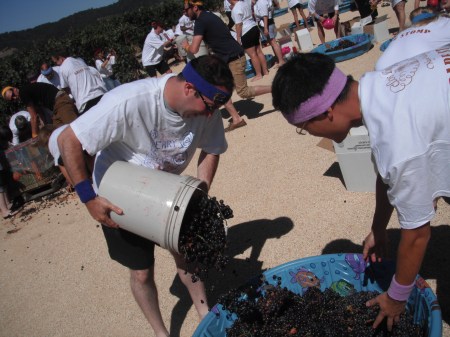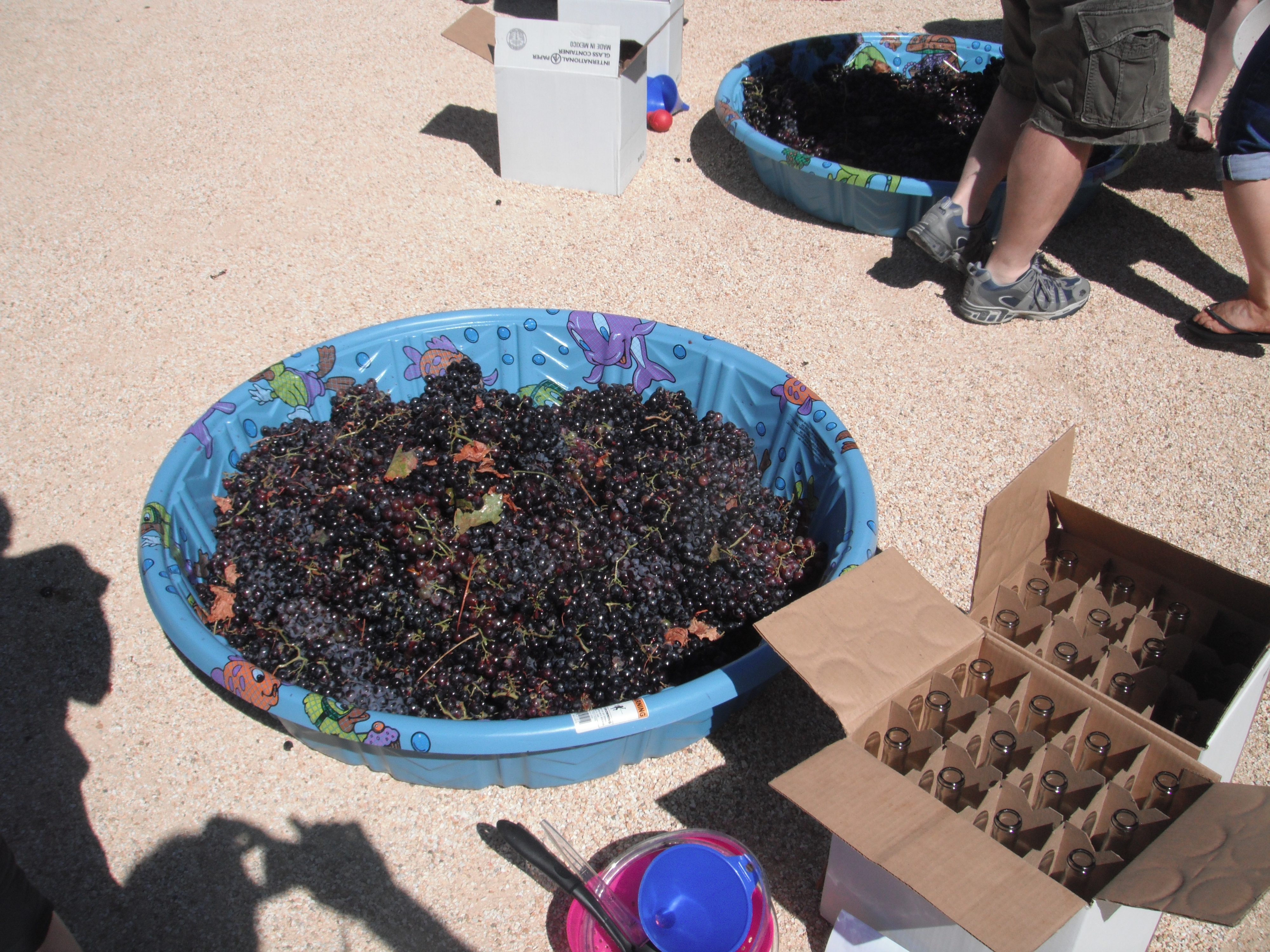 Once the whistle sounded, two members from each team went to a gigantic bin full of special grapes made just for stomping. Team mates gathered as many grapes as they could in their kiddie pools before the stomping began.