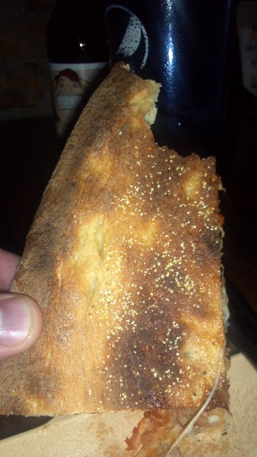 Pizzas are cut with scissors into strips, not the traditional pie or even Chicago favorite square-cut.  The strips, they work.  Everyone gets some crust, and the width of the slices are just about the size of ones mouth.  Genius.  I’m an immediate fan of this pizza as a whole.  Granted, these days it’s difficult to find awesome pizza for real cheap.  Roots serves up some of the best in town and it’s well worth the few extra bucks in my book.  No doubt.