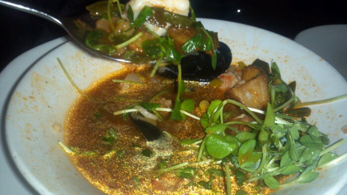 Jill enjoyed a “Meal in a Bowl” of delicious seafood accompanied by a spicy red broth. Perfectly cooked pieces of shrimp, fresh fish and mussels float in the liquid with cilantro, fresh greens and a melange of other spices. The dish is complex yet extremely fresh and light on its feet. While the broth is spicy, there is a zesty citrus driven lemon grass quality that separates it from other caldos.