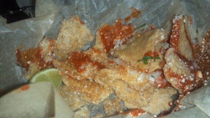 They were served with finely diced onions and a spicy red sauce which provided a nice contrast to the rich fatty niblets of pork skin.