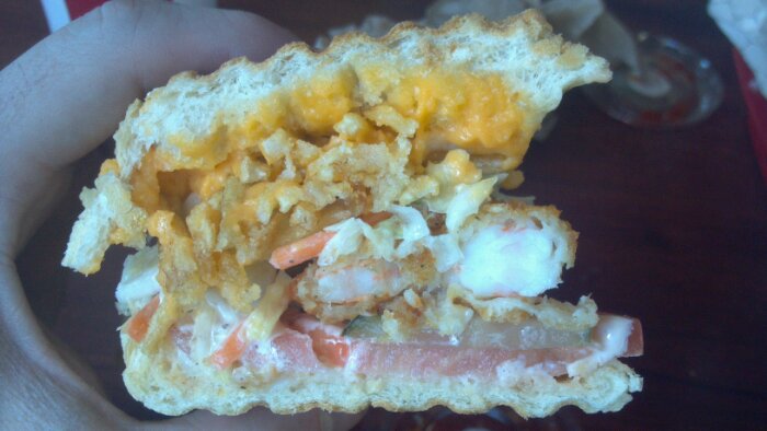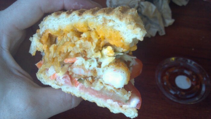 For the first time on Hungry Hungry I’m going to blog about an item TWICE. Why? Because this tasty morsel of bread and “meat” is just that good. The Shrimp Po’ Boy. Yeah, I know we just started with an order of fried shrimp…but when crafted into a delicious sandwich, it’s another story. Again, the execution was flawless. Awesome toasty Turano french bread that’s been pressed well. Shoe string potato strings for an added salty crunch? Check.