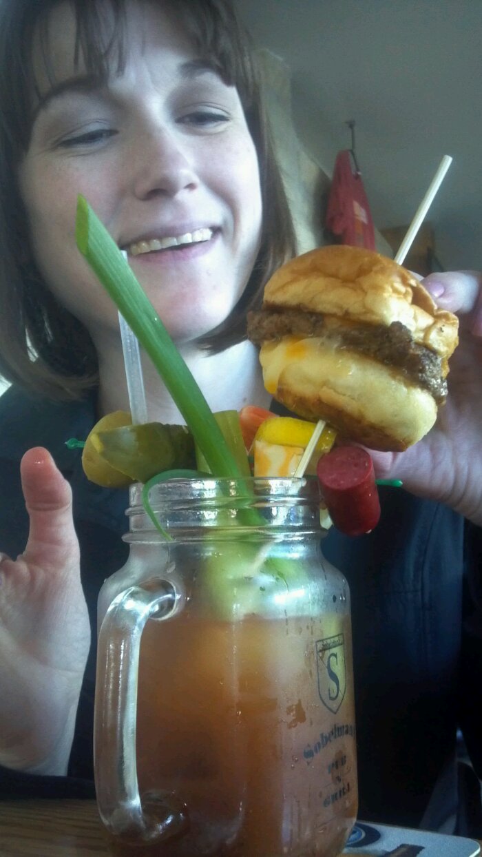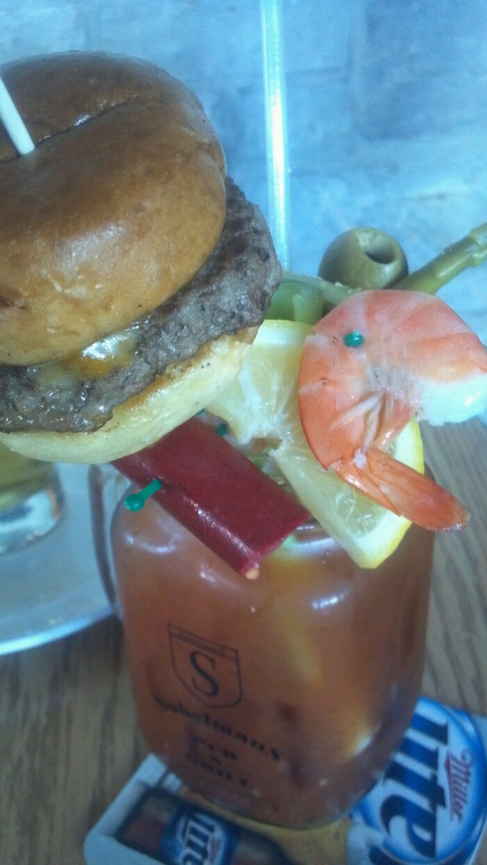 A delicious homemade Bloody Mary, no mix used here. It is spectacular and arrives in their extra large mug. Garnishes anyone? How about more than a dozen? Shrimp, olive, onion, sure. But then add asparagus, a cube of Wisconsin cheese, a chunk of meat stick…oh and did I mention a full slider?…yes they put a whole slider on TOP of the Bloody. Insane. Thank you God, you so exist.
