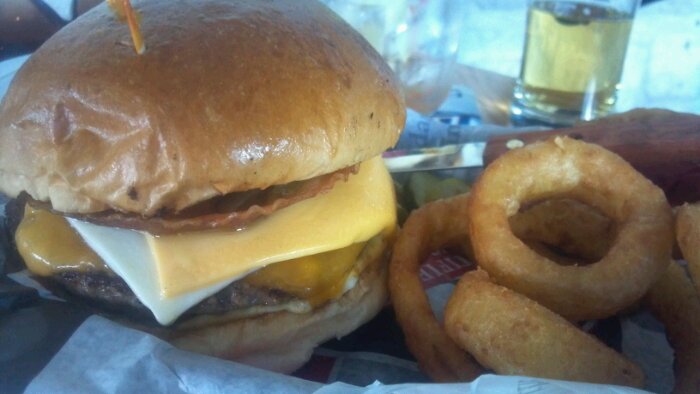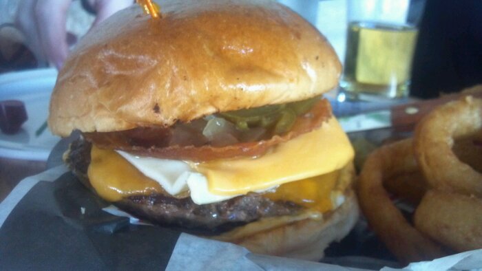 Smoky crispy bacon along with griddled onion and surprisingly mild jalapeno peppers complete the sandwich. The balance of veggies to beef and cheese is perfect. At first you see the sandwich and think the sheer amount of cheese will be overpowering – not the case.