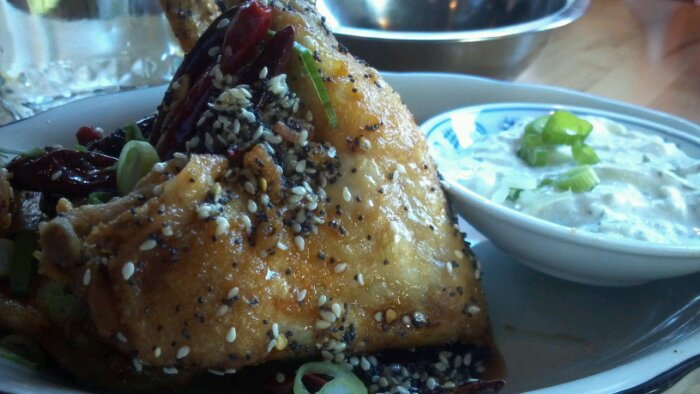 As this was a “snack” before dinner later – I know, I know, we only ordered two items. First up was something we planned ahead on ordering – the “Everything” Chicken Wings. Jumbo un-halved wings were placed before us. Covered in a mix of, well, everything…poppy and sesame seeds, two types of chilis, fried shallots and tzatziki sauce. They were delicious. Fried naked and just right.