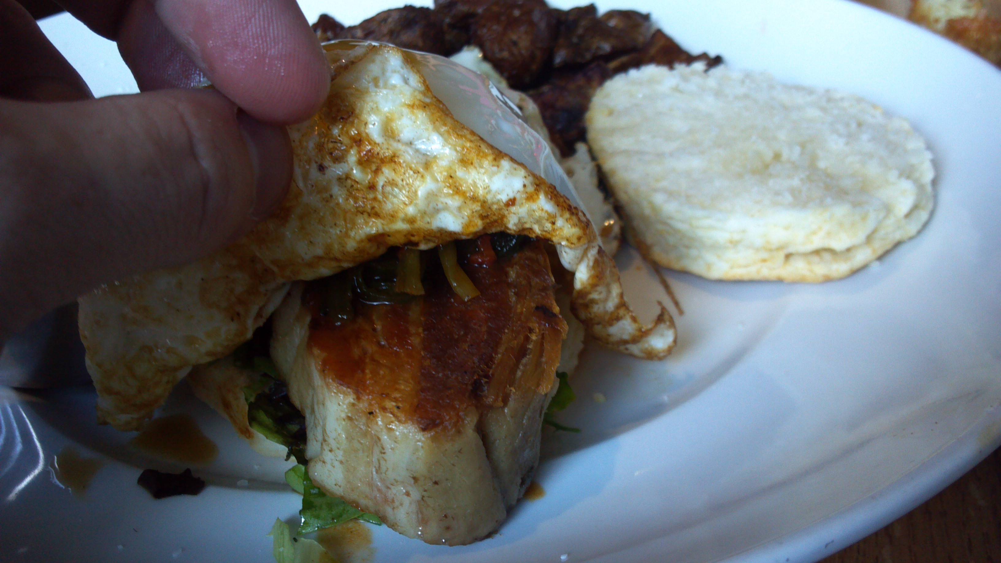 The sandy is finished with a simple sunny side up egg. This is a unique delicacy; a strong funky flavor with a nice acidic backbone from the kimchee cuts through the richness of the fatty belly and runny farm egg. Without a doubt this was a knife and forker. The biscuit was light and flaky and you could tell that the planning and execution of the dish had received the required attention.