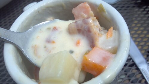 On first glance, from the surface, the chowder looks like your standard cup of soup. But once you dig your spoon and pull up some of the delicious chunks of goodness that rest within, you begin to realize how this is not your typical clam chowder.