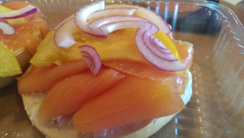 Lox and Bagel. For ten bucks you’re served a nice sized bagel – I apologize, I don’t know where it was purchased, but I do know it was soft and held up nicely to the toppings. The cream cheese was your standard deli style variety. I’m not sure if it was made in house, but it was great and plentiful. The garnish was a freshly sliced yellow tomato. It was sweet and juicy. Sliced the right thickness it was all that was needed besides a few slivers of red onion. Capers? Not here, but that’s fine. This lunch was all about the fish.