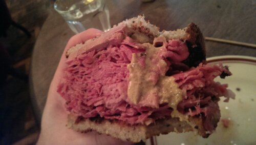 The bologna is light and sliced super thin – the best bologna I’ve ever tasted by far. The corned beef is fatty enough and sliced thin, too. Pastrami you can see through with a strong peppercorn quality is just what the sandwich needed. That would be a killer sandwich even if you stopped there. But no. Foie gras, the epitome of decadence is sliced a half inch thick and laid atop for good measure.